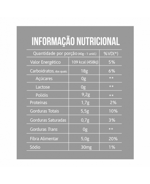 INGREDIENTES: Mix sem glúten (farinha de arroz, amido de milho, fécula de mandioca), óleo de soja, fibra solúvel (polidextrose), ovo em pó, cacau em pó, edulcorantes (maltitol e glicosídeos de esteviol), emulsificantes (ésteres de poliglicerol de ácidos graxos, mono e diglicerídeos de ácidos graxos, glicerol, goma xantana), conservantes (sorbato de potássio, propionato de cálcio), fermentos químicos (pirofosfato ácido de sódio, bicarbonato de sódio), acidulante (ácido cítrico) e aromas.