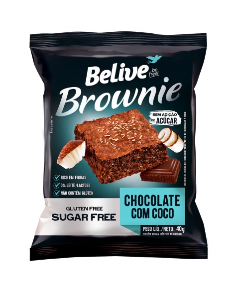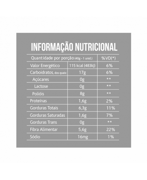 INGREDIENTES: Mix sem glúten (farinha de arroz, amido de milho, fécula de mandioca), maltitol, óleo vegetal (girassol), fibra solúvel (polidextrose), ovo em pó, coco ralado, cacau em pó, emulsificantes (mono e diglicerídeos de ácidos graxos e ésteres de poliglicerol, glicerina e goma xantana),conservantes (propionato de cálcio, sorbato de potássio), fermento químico (pirofosfato dissódico), acidulante (ácido cítrico), edulcorante natural (glicosídeo de esteviol) e aromas.