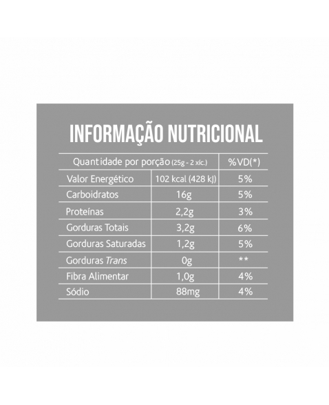 INGREDIENTES: Mix sem glúten (farinha de arroz, farinha integral de sorgo, chia e quinoa), óleo vegetal (palma e soja), ervas aromáticas, sal light, cúrcuma e aromas.
