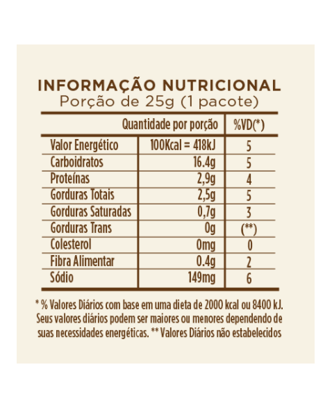 Ingredientes: Farinha de arroz, farinha integral de soja não transgênica, óleo vegetal (palma, soja), sal light, corante natural urucum, aromas.