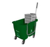 Equipamento de limpeza formado por balde com sistema de 2 águas com divisória. A primeira divisória recebe água com o agente químico para limpeza do piso; a segunda divisória serve para enxaguar o refil, que removerá as sujeiras da superfície.