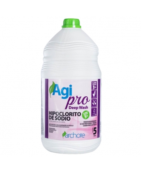 O AgiPro Hipoclorito de Sódio 5% da ARCHOTE é um desinfetante de uso geral, altamente eficaz na desinfecção, alvejamento e branqueamento de superfícies. Indicado para limpeza pesada de ralos, vasos sanitários, pisos, lixeiras e também para o tratamento de água e efluentes, possui ação comprovada contra microrganismos como Staphylococcus aureus e Salmonella choleraesuis.