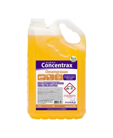 Concentrax Desengraxax é um produto de alto poder de limpeza, com excelente capacidade para dissolver gorduras, óleos vegetais e minerais, devido à sua alta alcalinidade. Possui forte ação desengordurante e é eficaz na remoção de sujeiras orgânicas e incrustações. É indicado para a limpeza de oficinas, concessionárias de veículos e superfícies impregnadas com óleos, graxas, parafinas e ceras. Pode ser aplicado em utensílios, pisos, azulejos, fornos, chapas, grelhas, fritadeiras, coifas, fogões e equipamentos de aço inoxidável.