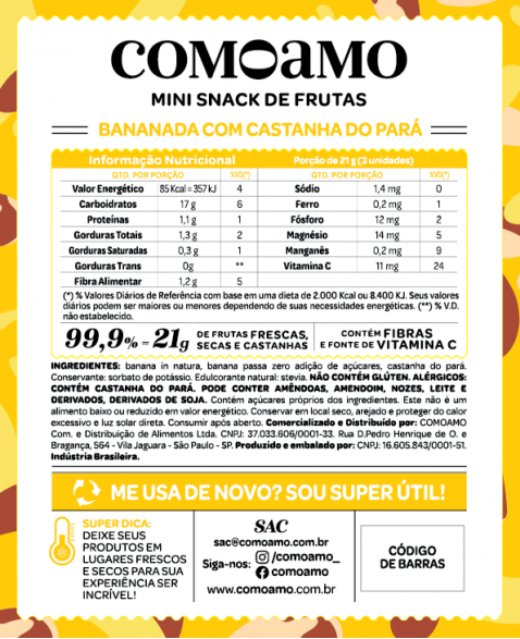 INGREDIENTES: banana in natura, banana passa zero adição de açúcares, castanha do pará. Conservante: sorbato de potássio. Edulcorante natural: stevia.