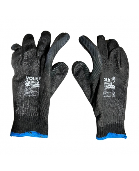 A Luva Black Tractor Grande - VOLK é confeccionada em fibras sintéticas e naturais, com revestimento na palma e dedos em borracha vulcanizada. Seu design anatômico e punho tricotado proporcionam conforto e segurança, enquanto o grip ondulado garante excelente aderência no manuseio de objetos secos ou molhados.