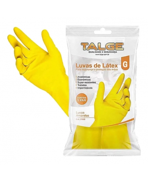 A Luva Multiuso Amarela Talge é confeccionada em látex de borracha natural, com superfície antiderrapante na palma e nos dedos, garantindo uma pegada firme e segura. Anatômica, sem forro e impermeável, ela é ideal para proteger as mãos em serviços de higienização, jardinagem, atividades domésticas e industriais.