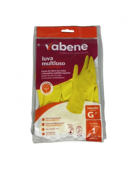 A Luva Multiuso Amarela G da Vabene é confeccionada em látex natural, oferecendo proteção e conforto para diversas atividades domésticas e profissionais. Seu design anatômico e flexível proporciona ajuste perfeito às mãos, reduzindo a fadiga muscular durante o uso. A superfície antiderrapante na palma e nos dedos garante melhor aderência no manuseio de objetos. Ideal para limpezas leves e moderadas, manipulação de alimentos e outras tarefas que requerem higiene e segurança.