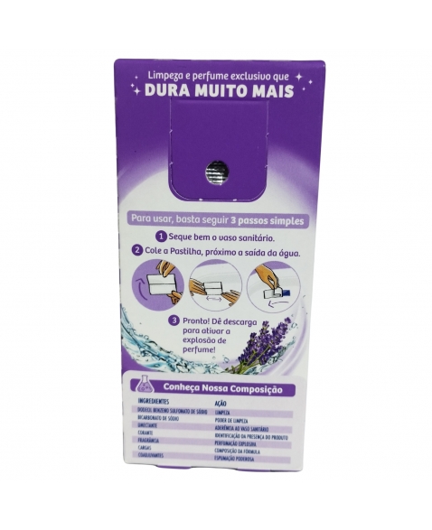 Modo de uso: Limpe e seque bem a área interna do vaso sanitário, logo abaixo da borda. Em seguida, remova a película protetora da pastilha e pressione-a firmemente contra a parede do vaso, em um ponto onde haja fluxo de água. Após a aplicação, descarte a embalagem e utilize o vaso normalmente. Quando a pastilha se dissolver completamente, substitua por uma nova.