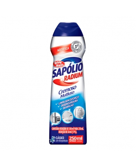 O Sapólio Radium Cremoso 250ml Clássico é um produto multiuso que desengordura, remove manchas e dá brilho sem riscar, oferecendo uma ótima performance em diferentes superfícies.