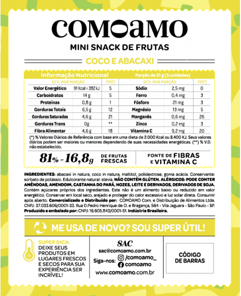 INGREDIENTES: abacaxi in natura, coco in natura, maltitol, polidextrose, goma acácia. Conservante: sorbato de potássio. Edulcorante natural: stevia.