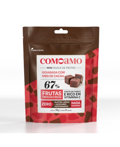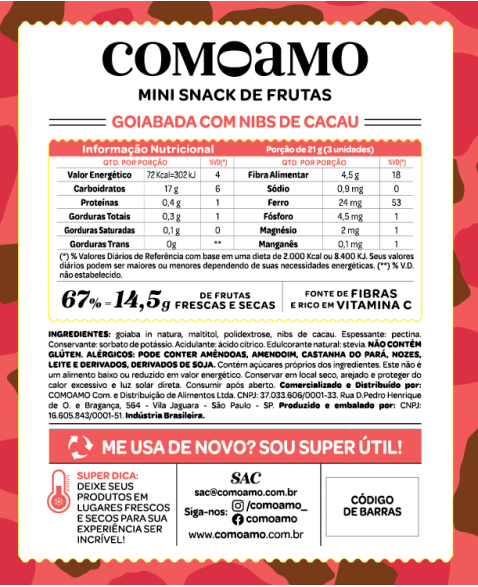 INGREDIENTES: goiaba in natura, maltitol, polidextrose, nibs de cacau. Espessante: pectina. Conservante: sorbato de potássio. Acidulante: ácido cítrico. Edulcorante natural: stevia.