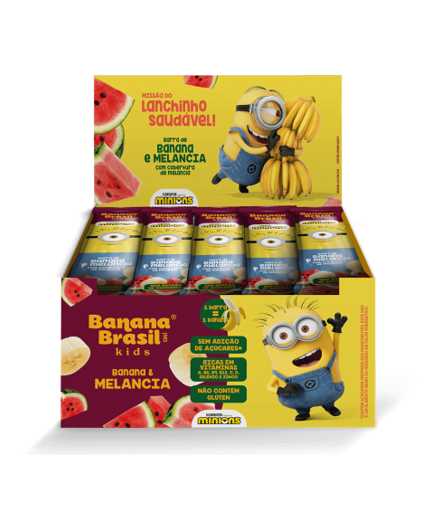 Ingredientes: Banana-passa, cobertura de chocolate branco com uva sem adição de açúcares, uva desidratada, mix de vitaminas e minerais (Vitamina A, Vitamina D, Vitamina C, Vitamina B6, Ácido fólico, Vitamina B12, Selênio e Zinco) e aromatizante natural.