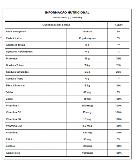 INGREDIENTES: Blend proteico (proteína isolada do soro do leite (whey isolado), proteína isolada de ervilha e colágeno hidrolisado), recheio de chocolate branco com biscoito sabor baunilha sem açúcar, cobertura de chocolate branco sem açúcar, fibras de polidextrose* e acácia, maltitol, óleo de coco, mix de vitaminas e minerais (Vitamina A, Vitamina D2, Vitamina C, Vitamina B6, Ácido fólico, Vitamina B12, Selênio e Zinco), umectante glicerina, acidulante ácido cítrico, emulsificante lecitina de girassol e aromatizantes.