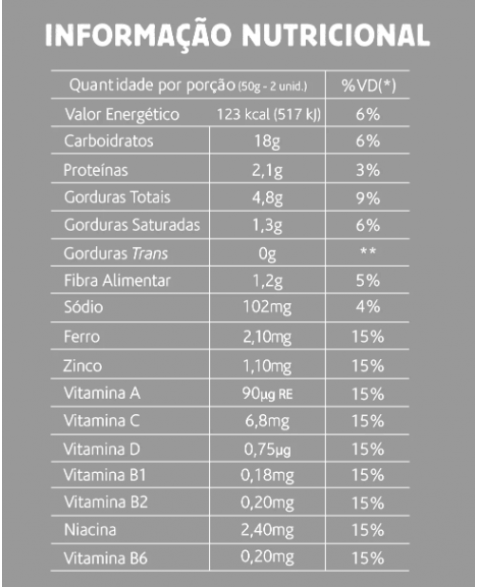 INGREDIENTES: Mix sem glúten (farinha de arroz, amido modificado, farinha de sorgo integral, fécula de mandioca, farinha de soja integral não transgênica, proteína isolada de soja, farinha de milho não transgênico, cenoura em pó, batata-doce), óleo vegetal, açúcar orgânico de rapadura, ovo em pó, açúcar, leite de coco em pó, sal, glucose, chia, quinoa, mix de vitaminas e minerais (vitamina C, ferro, niacina, zinco, vitamina A, vitamina D, vitamina B6, vitamina B1, vitamina B2), psyllium, emulsificantes goma xantana, mono e diglicerídeos de ácidos graxos e hidroxipropil metil celulose, antioxidante extrato de alecrim, conservante propionato de cálcio, acidulante ácido cítrico e aroma.