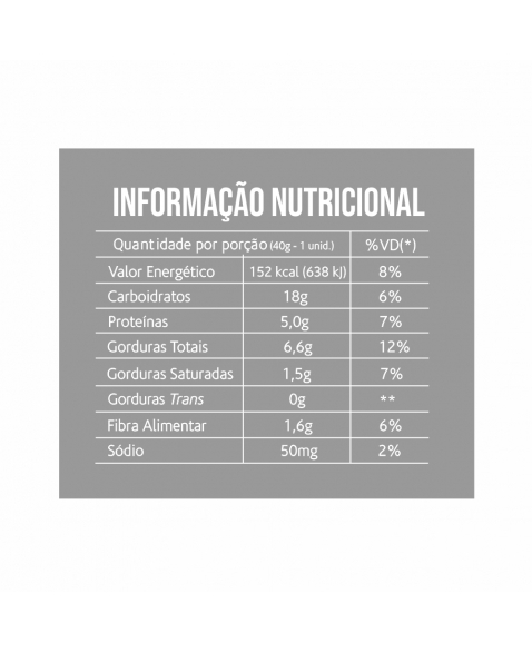 INGREDIENTES: Açúcar (cristal e mascavo), mix sem glúten (proteínas de ervilha e arroz; farinha integral de aveia sem glúten), óleo de girassol, ovo em pó, gotas de chocolate amargo (açúcar cristal, gordura vegetal, cacau em pó e massa de cacau), cacau em pó, amido modificado, umectantes (glucose e glicerol), fermento químico (pirofosfato ácido de sódio e bicarbonato de sódio), emulsificantes (mono e diglicerídeo de ácidos graxos e goma xantana), conservantes (propionato de cálcio e sorbato de potássio), acidulante (ácido cítrico) e aromas.