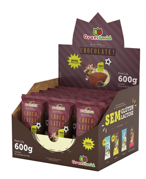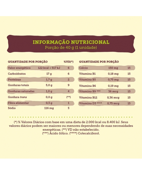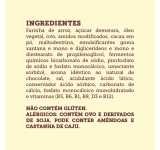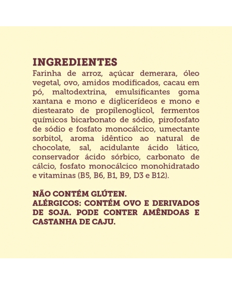 Ingredientes: Farinha de arroz, açúcar demerara, óleo vegetal, ovo, amidos modificados, cacau em pó, maltodextrina, emulsificantes goma xantana e mono e diglicerídeos e mono e diestearato de propilenoglicol, fermentos químicos bicarbonato de sódio, pirofosfato de sódio e fosfato monocálcico, umectante sorbitol, aroma idêntico ao natural de chocolate, sal, acidulante ácido lático, conservador ácido sórbico, carbonato de cálcio, fosfato monocálcico monohidratado e vitaminas (B5, B6, B1, B9, D3 e B12).