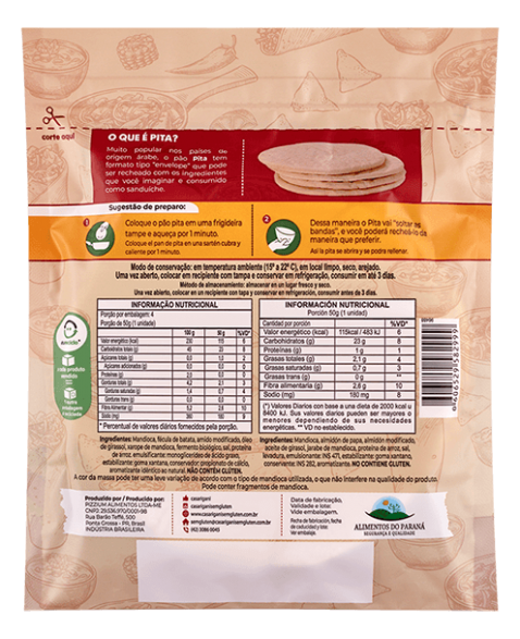 Ingredientes: Mandioca, fécula de batata, amido modificado, óleo de girassol, xarope de mandioca, fermento biológico, sal, proteína de arroz, emulsificante: monoglicerídeo de ácido graxo, estabilizante: goma xantana, conservador: propionato de cálcio e aromatizante.
