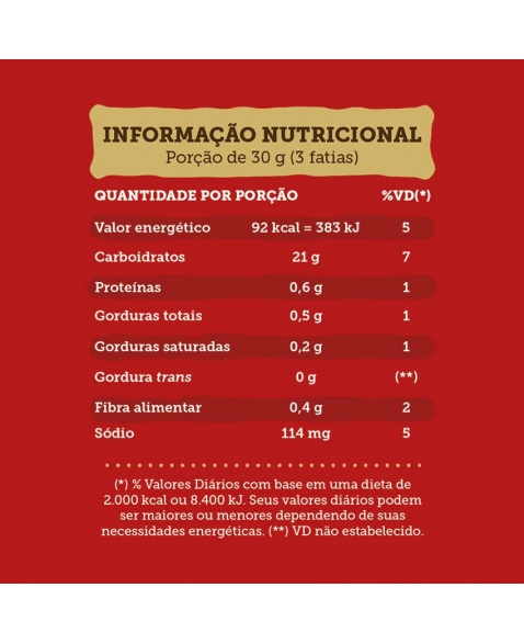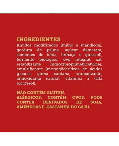 Ingredientes: Amidos modificados (mandioca e milho), gordura de palma, açúcar demerara, fermento biológico, ovo integral em pó, sal, sementes (chia, linhaça e girassol) emulsificante monoglicerídeo de ácido graxo, estabilizantes hidroxipropilmetilcelulose e goma xantana, salona, aromatizante idêntico ao natural, antioxidante natural vitamina E.