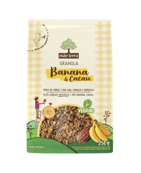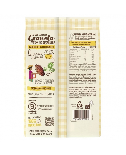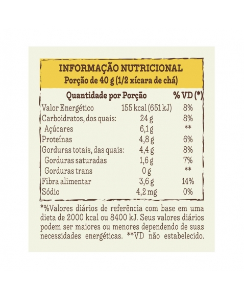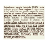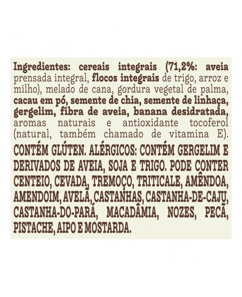 INGREDIENTES: cereais integrais (71,2%: aveia prensada integral, flocos integrais de trigo, arroz e milho) melado de cana, gordura vegetal de palma, cacau em pó, semente de chia, semente de linhaça, gergelim, fibra de aveia, banana desidratada, aromas naturais e antioxidante tocoferol (natural, também chamado de vitamina E).