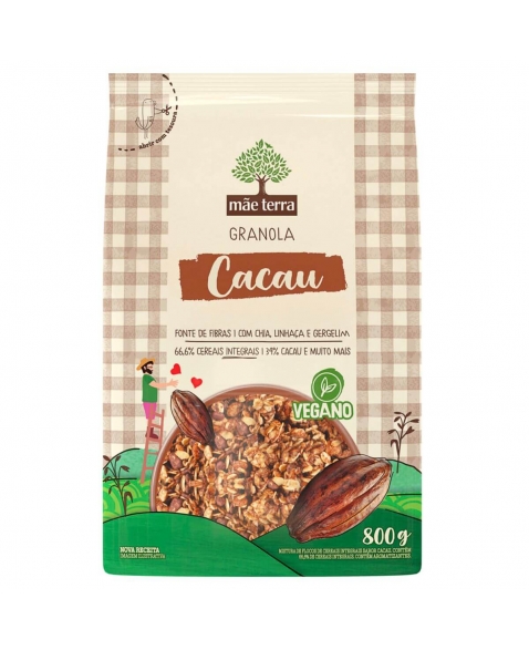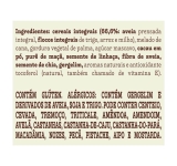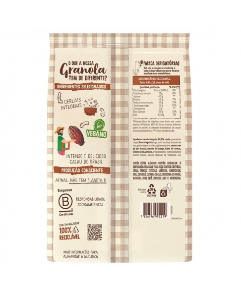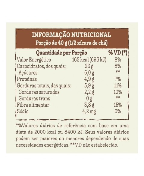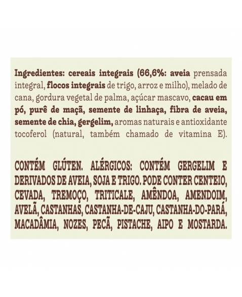 INGREDIENTES: cereais integrais (66,6%: aveia prensada integral, flocos integrais de trigo, arroz e milho) melado de cana, gordura vegetal de palma, açúcar mascavo, cacau em pó, purê de maçã, semente de linhaça, fibra de aveia, semente de chia, gergelim, aromas naturais e antioxidante tocoferol (natural, também chamado de vitamina E).