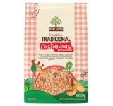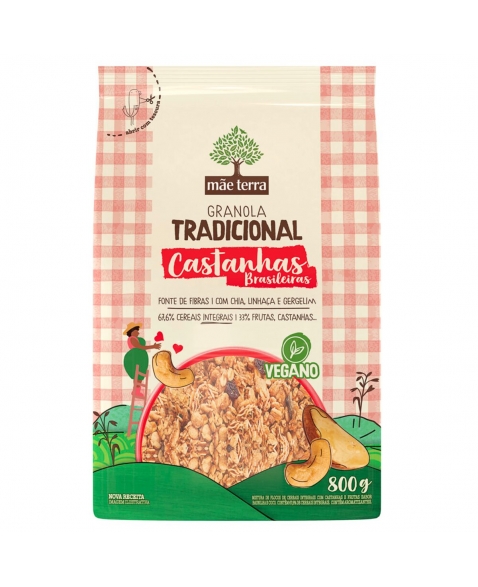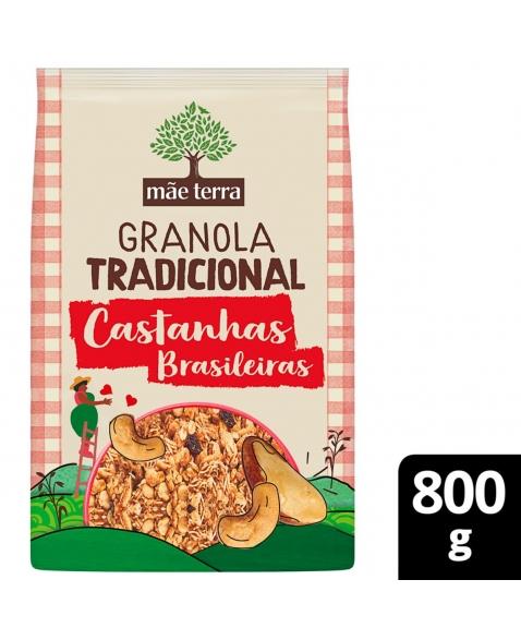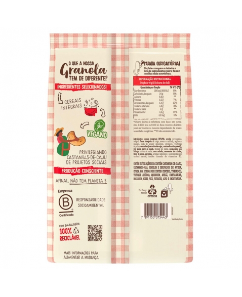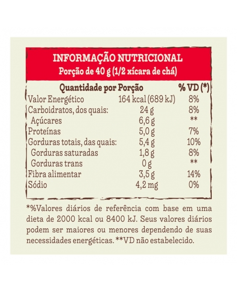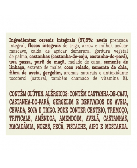 INGREDIENTES: Cereais integrais (67,6%: aveia prensada integral, flocos integrais de trigo, arroz e milho), açúcar mascavo, calda de açúcar demerara, gordura vegetal de palma, castanhas (castanha-de-caju, castanha-do-pará), uva passa, purê de maçã, melado de cana, semente de linhaça, extrato de malte, coco ralado, semente de chia, fibra de aveia, gergelim, aromas naturais e antioxidante tocoferol (natural, também chamado de vitamina E).