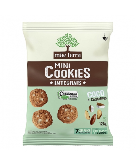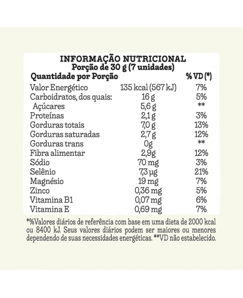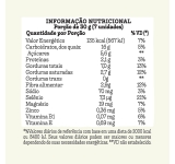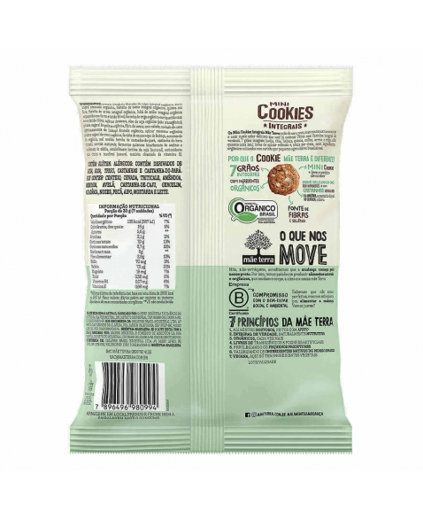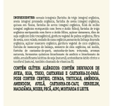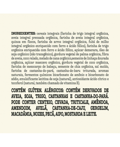 INGREDIENTES: cereais integrais (farinha de trigo integral orgânica, aveia integral prensada orgânica, farinha de aveia integral orgânica, quinoa em flocos, farinha de arroz integral orgânica, fubá de milho integral orgânico enriquecido com ferro e ácido fólico), farinha de trigo orgânica enriquecida com ferro e ácido fólico, açúcar demerara, óleo de soja orgânico (não transgênico), gordura vegetal de palma orgânica, fibra de aveia, coco ralado, melado de cana orgânico, semente de linhaça orgânica, açúcar mascavo orgânico, gordura vegetal de coco orgânica, farinha de mesocarpo de babaçu, semente de chia orgânica, sal moído, farinha de castanha-do-pará, castanha-de-baru triturada, aromas naturais, fermentos químicos bicarbonato de amônio e bicarbonato de sódio, emulsificante lecitina de soja (natural), antioxidante ácido cítrico e tocoferol (natural, também chamado de vitamina E).