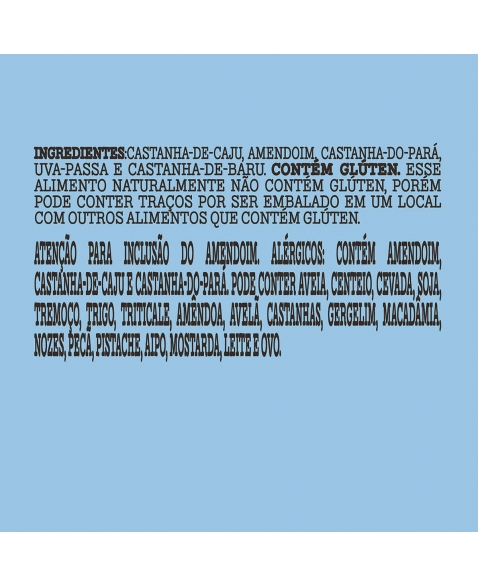 INGREDIENTES: Castanhas (caju, Pará e baru) e uva passa.