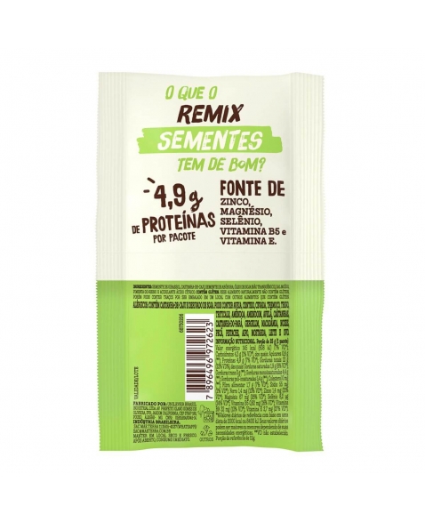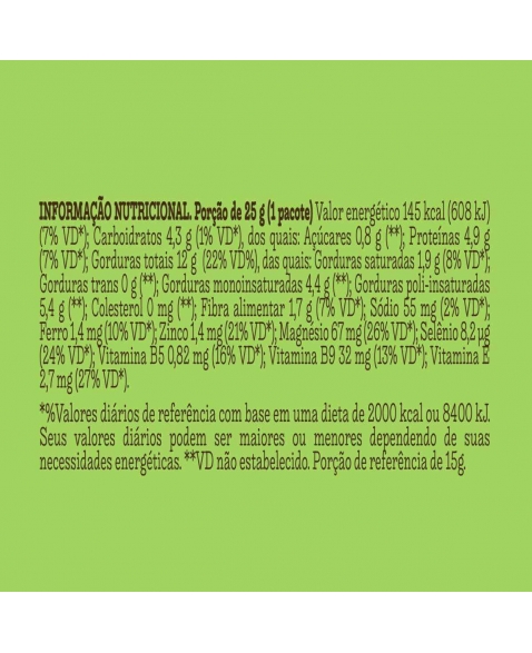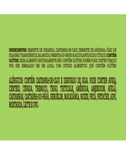 INGREDIENTES: Sementes (girassol e abóbora), castanha-de-caju, óleo de soja (não transgênico), sal moído, pimenta-do-reino e acidulante ácido cítrico (natural).